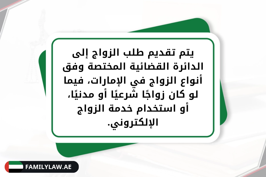 ومن ثم، يتم تقديم طلب الزواج إلى الدائرة القضائية المختصة وفق أنواع الزواج في الإمارات، فيما لو كان زواجاً شرعيًا أو مدنيًا، أو استخدام خدمة الزواج الإلكتروني.