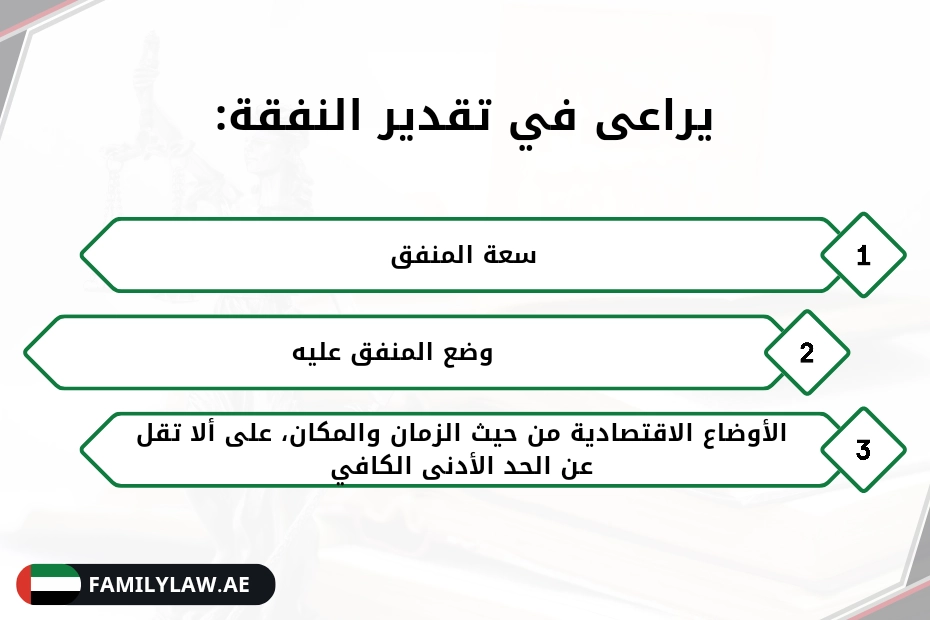 ويراعى في تقدير النفقة سعة المنفق ووضع المنفق عليه، والأوضاع الاقتصادية من حيث الزمان والمكان، على ألا تقل عن الحد الأدنى الكافي. كما أجاز القانون زيادة النفقة أو إنقاصها تبعاً لتغير الظروف.