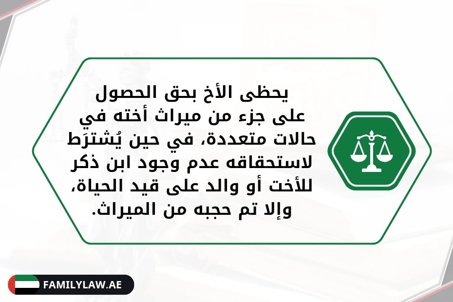 يحظى الأخ بحق الحصول على جزء من ميراث أخته في حالات متعددة، في حين يشترط لاستحقاقه عدم وجود ابن ذكر للأخت أو والد على قيد الحياة وإلا تم حجبه من الميراث.