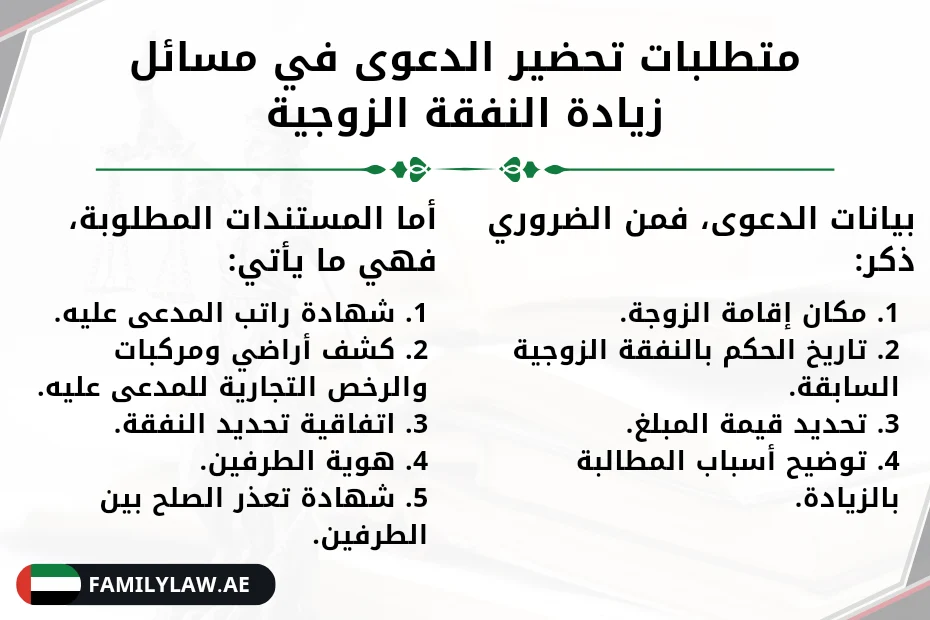 وقد حدد الدليل الإرشادي لقانون الأحوال الشخصية الإماراتي، متطلبات تحضير الدعوى في مسائل زيادة النفقة الزوجية، فتشمل البيانات والمستندات التالية: