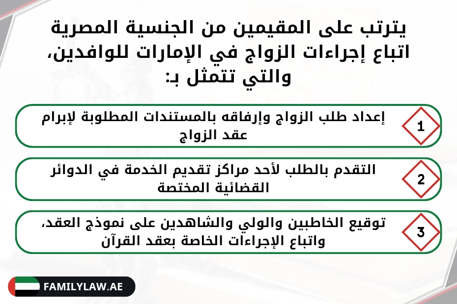 يترتب على المقيمين من الجنسية المصرية اتباع إجراءات الزواج في الإمارات للوافدين، والتي تتمثل بإعداد طلب الزواج وإرفاقه بالمستندات المطلوبة لإبرام عقد الزواج.
