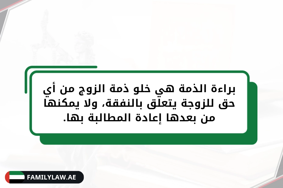 براءة الذمة هي خلو ذمة الزوج من أي حق للزوجة يتعلق بالنفقة، ولا يمكنها من بعدها إعادة المطالبة بها، حيث تتعدد الأسباب التي تفضي إلى براءة ذمة الزوج من النفقة الواجبة عليه، والتي تتمثل فيما يلي: