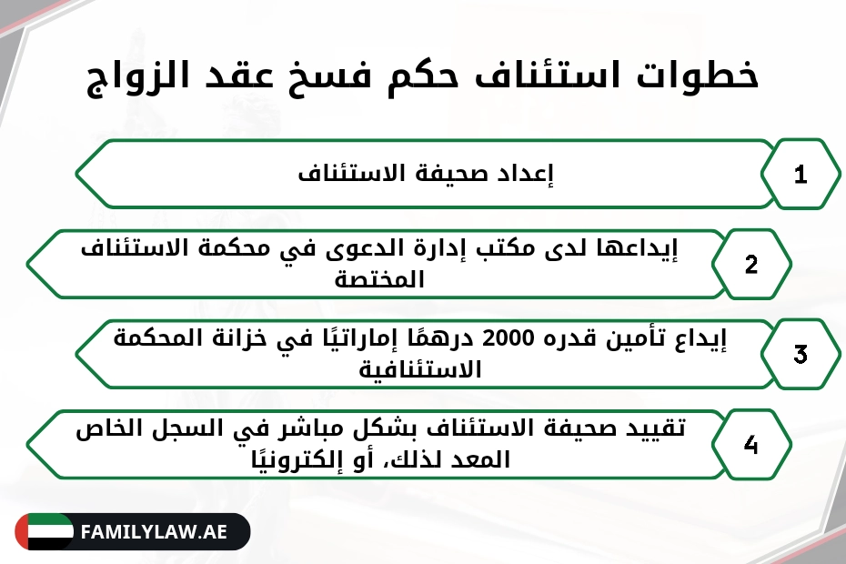 يحق للزوجين في قضايا فسخ عقد الزواج وفق الشروط التي حددها قانون الأحوال الشخصية الإماراتي الجديد الطعن بالاستئناف، بشرط ألا يتم الاستئناف في الحالات المستثناة في القانون.