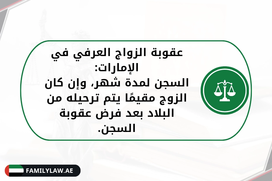 كما أن إبرام عقد زواج عرفي يعرض الزوجين لنيل عقوبة الزواج العرفي في الامارات، والمتمثلة بالسجن لمدة شهر، وإن كان مقيمًا يتم ترحيله من البلاد بعد فرض عقوبة السجن.