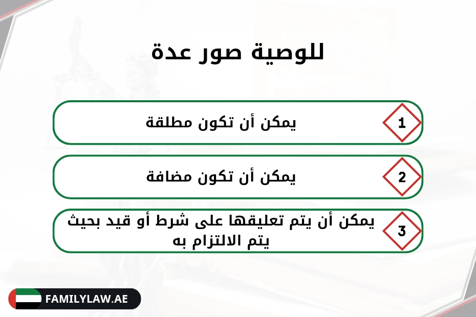 ومن الجدير بالذكر، أن للوصية صور عدة، حيث يمكن أن تكون مطلقة، أو تكون وصية مضافة، أو يتم تعليقها على شرط أو قيد بحيث يتم الالتزام به.