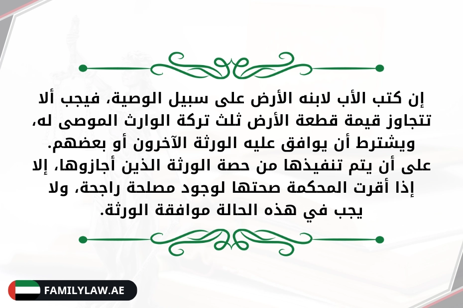 وإن كتب له الأرض على سبيل الوصية، فيجب ألا تتجاوز قيمة قطعة الأرض ثلث تركة الوارث الموصى له، ويشترط أن يوافق عليه الورثة الآخرون أو بعضهم.