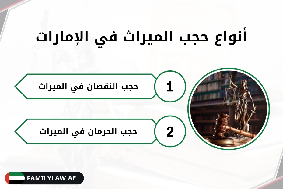 ينطوي الحجب في الميراث على نوعين، بحيث يكون أحد الورثة محجوب بشخص آخر، وتتمثل أنواع الحجب في الميراث بما يلي: