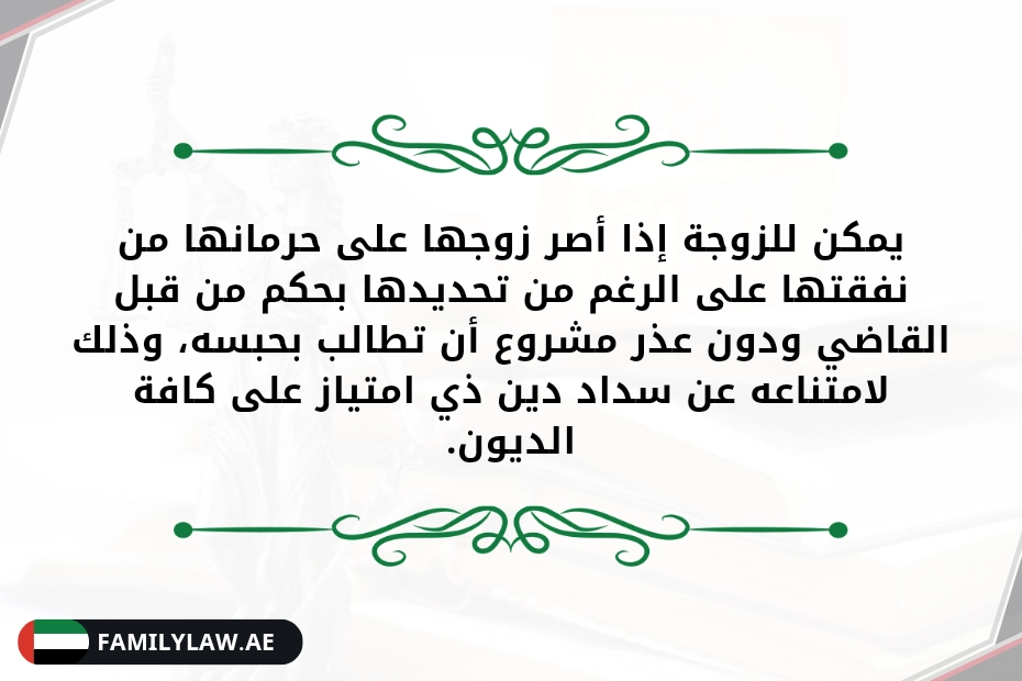 يمكن للزوجة إذا أصر على حرمانها من نفقتها على الرغم من تحديدها بحكم من قبل القاضي ودون عذر مشروع أن تطالب بحبسه، وذلك لامتناعه عن سداد دين ذو امتياز على كافة الديون.
