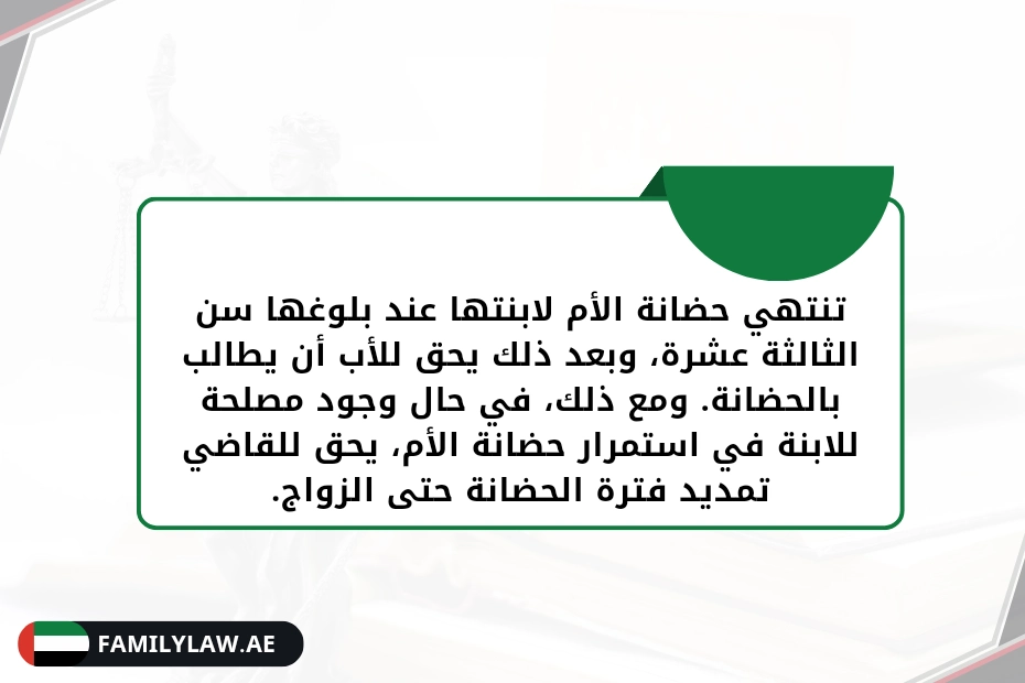 جاء في المادة 156 من قانون الأحوال الشخصية الإماراتي أن حضانة الابنة تنتهي عند بلوغها سن الثالثة عشرة، وبعد ذلك يحق للأب أن يطالب بالحضانة. ومع ذلك، في حال وجود مصلحة للابنة في استمرار حضانة الأم، يحق للقاضي تمديد فترة الحضانة حتى الزواج.