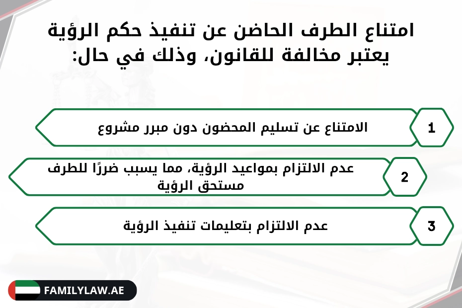 وذلك في حال الامتناع عن تسليم المحضون دون مبرر مشروع، أو عدم الالتزام بمواعيد الرؤية مما يسبب ضررًا للطرف مستحق الرؤية، أو عدم الالتزام بتعليمات تنفيذ الرؤية.