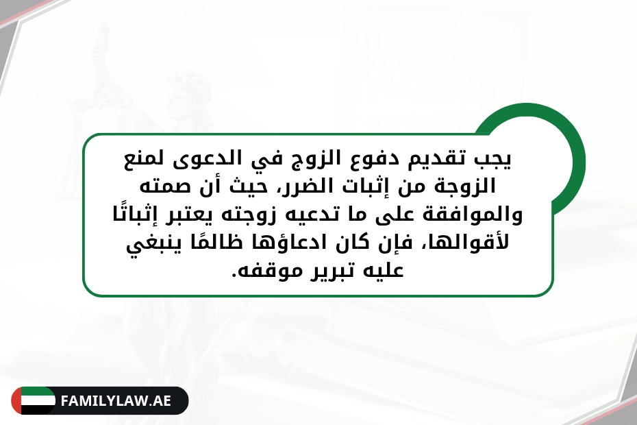 ويجب تقديم دفوعه في الدعوى لمنع الزوجة من إثبات الضرر، حيث أن صمته والموافقة على ما تدعيه الزوجة يعتبر إثباتًا لأقوالها، فإن كان ادعاؤها ظالمًا ينبغي عليه تبرير موقفه.