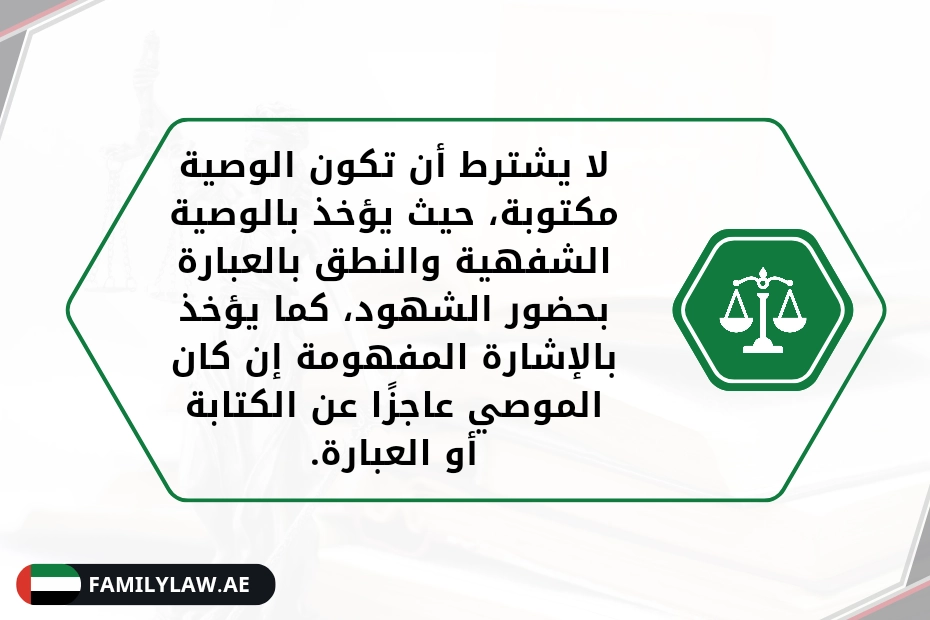 كما لا يشترط أن تكون الوصية مكتوبة، حيث يؤخذ بالوصية الشفهية والنطق بالعبارة بحضور الشهود، كما يؤخذ بالإشارة المفهومة إن كان الموصي عاجزًا عن الكتابة أو العبارة.