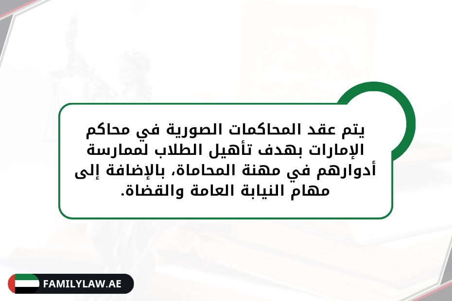 حيث يتم عقد المحاكمات الصورية في محاكم الإمارات بهدف تأهيل الطلاب لممارسة أدوارهم في مهنة المحاماة، بالإضافة إلى مهام النيابة العامة والقضاة.