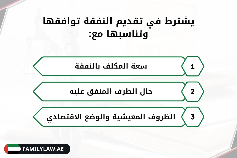 إلا أن تقديم النفقة لتوفير كافة هذه المتطلبات والمستلزمات يشترط توافقها وتناسبها مع سعة المكلف بالنفقة، وحال الطرف المنفق عليه، والظروف المعيشية والوضع الاقتصادي.