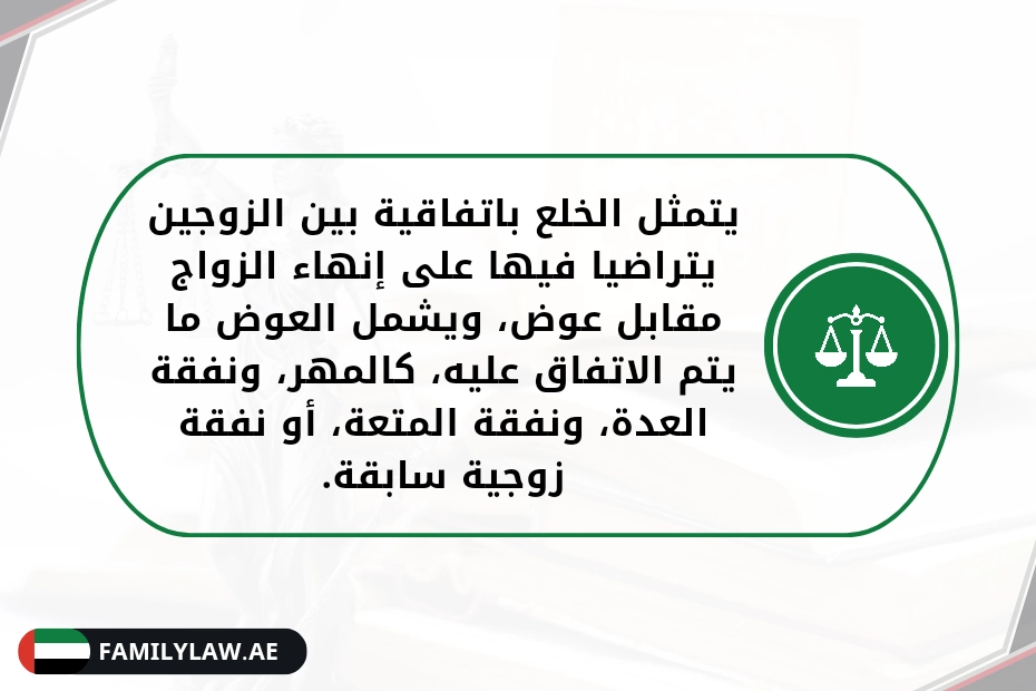 يتمثل الخلع باتفاقية بين الزوجين يتراضيا فيها على إنهاء الزواج مقابل عوض، ويشمل العوض ما يتم الاتفاق عليه كالمهر ونفقة العدة ونفقة المتعة أو نفقة زوجية سابقة.