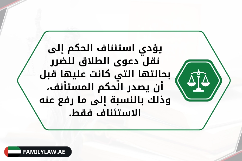 ومن الجدير بالذكر، أن استئناف الحكم الصادر يؤدي إلى نقل دعوى الطلاق للضرر بحالتها التي كانت عليها قبل أن يصدر الحكم المستأنف، وذلك بالنسبة إلى ما رفع عنه الاستئناف فقط.