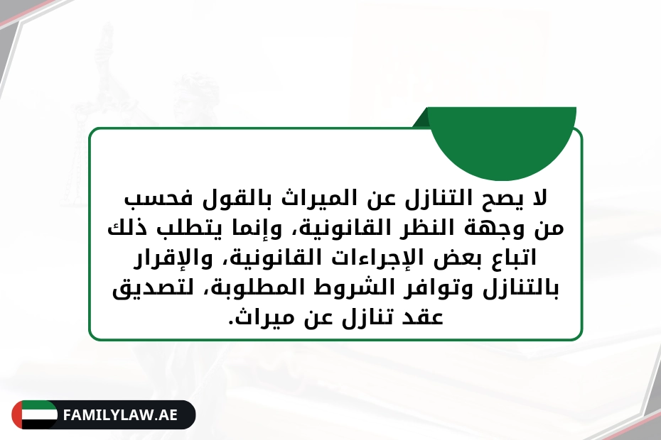 لا يصح التنازل عن الميراث بالقول فحسب من وجهة النظر القانونية، وإنما يتطلب ذلك اتباع بعض الإجراءات القانونية، والإقرار بالتنازل وتوافر الشروط المطلوبة، لتصديق عقد تنازل عن ميراث.